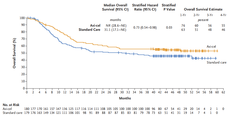 ②axi-cel组的死亡患者为82例,而标准二线治疗组则达到了95例,axi-cel组患者在总体生存(OS)方面具有显著的优势,axi-cel组的中位OS尚未达到(NR),而标准二线治疗组的中位OS为31.1个月(HR=0.73,95%CI:0.54~0.98,P=0.03),预估的4年OS分别为54.6%(axi-cel组)vs 46%(标准二线治疗组),具体详见下图。