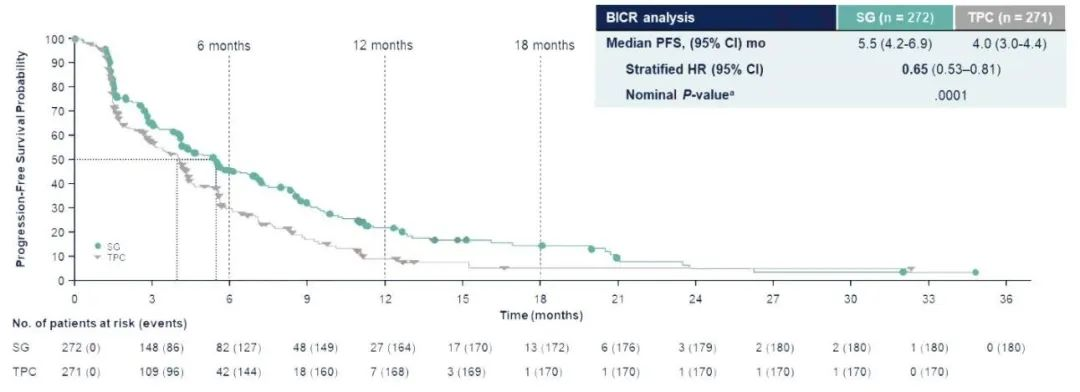 SG在既往接受过至少二线化疗(至少一线用于复发转移阶段)的转移性三阴性乳腺癌(mTNBC)患者中表现出显著临床效果。相较于医生选择治疗(TPC),SG在PFS(5.6 vs.1.7个月,HR=0.39)和OS(12.1 vs.6.7个月,HR=0.48)方面,均表现出明显改善。