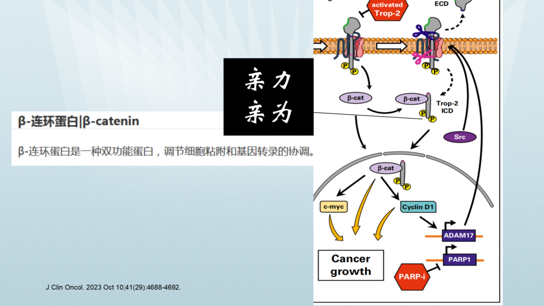 通过三种蛋白水解酶(ADAM10、ADAM17、γ-secreatase)的剪切作用而激活Trop-2,释放其胞外段和胞内段结构域,参与肿瘤相关信号转导。一旦其胞外段和胞内段分离,胞内段会直接进入细胞内,甚至进入细胞核,并与β-连环蛋白(β-catenin)结合,启动下游信号转导,激活Cyclin D1、c-myc等癌基因,促使肿瘤增殖。因此,Trop-2具有“亲力亲为”的特点,通过蛋白结构域分离的方式,直接参与到下游信号转导。