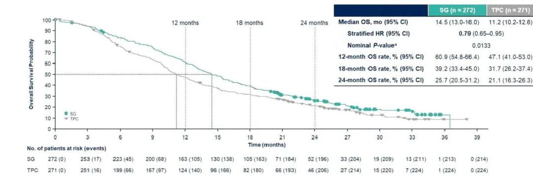 在既往接受CDK4/6抑制剂(CDK4/6i)和内分泌治疗、且2到4线化疗的HR+/HER2-转移性乳腺癌(mBC)患者中,SG也显示出显著治疗效果。与TPC相比,接受SG治疗的患者,PFS(5.5 vs.4.0个月,HR=0.65)和OS(14.5 vs.11.2个月,HR=0.79)均获得显著改善。