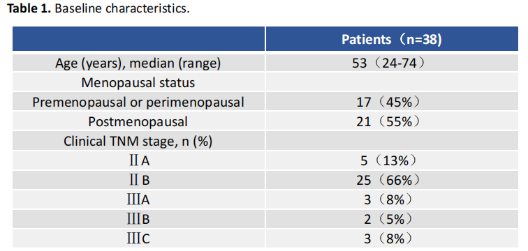 2022年4月至2023年6月期间38例患者筛选入组,全部患者ER≥50%,Ki67≥20%患者占比84%(32/38)。