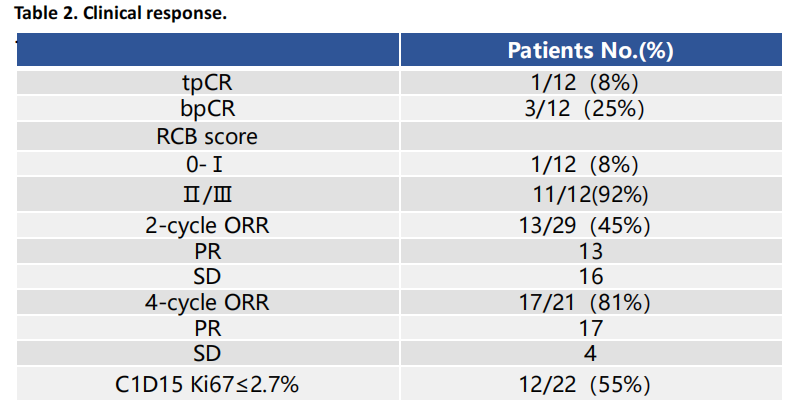 21例患者完成4周期的疗效评估,ORR为81%(17/21);22例患者完成C1D15穿刺及Ki67检测,其中C1D15 Ki67≤2.7%的比例为55%(12/22);12例患者完成达尔西利联合来曲唑8周期新辅助治疗后的手术,术后RCB评分:RCB(0-Ⅰ)患者1例,RCB(Ⅱ-Ⅲ)患者11例。