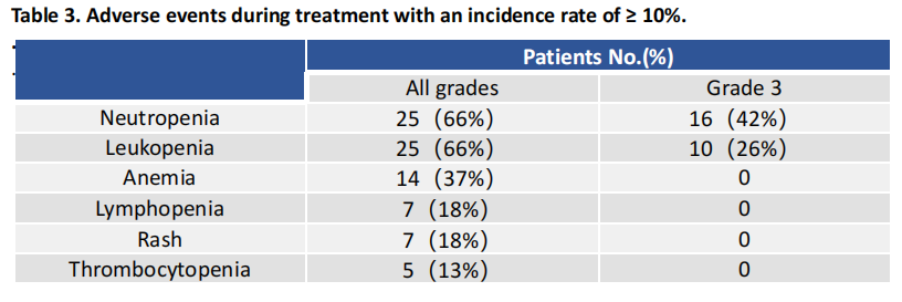 最常见的不良事件为中性粒细胞计数降低,发生率66%(25/38);其中≥3级患者16例(42%),没有发生4级及以上的不良事件。