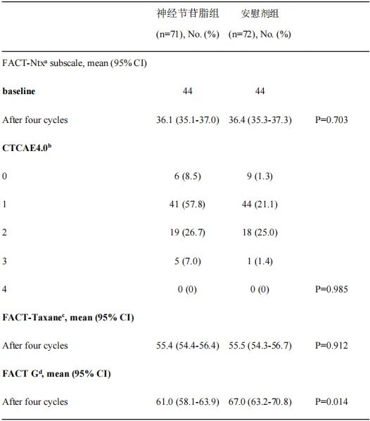经过四个周期的白蛋白结合型紫杉醇化疗后,神经节苷脂组患者的平均FACT-Ntx评分分为36.1(95%CI:35.1~37.0),安慰剂组患者为36.4(95%CI:35.3~37.3),两组患者的平均FACT-Ntx评分相似。与基线相比,神经节苷脂组患者在四个化疗周期后两周的FACT-Ntx平均得分下降了7.9(P<0.001),安慰剂组下降了7.6(P<0.001),神经节苷脂组与安慰剂组之间的差异无统计学意义(P=0.703)。神经节苷脂组在四个化疗周期后两周的FACT-G评分(61.0,95%CI:58.1~63.9)低于对照组(67.0,95%CI:63.2~70.8),差异有统计学意义(P=0.014)。其他次要结果在神经节苷脂组和对照组间差异无统计学意义。