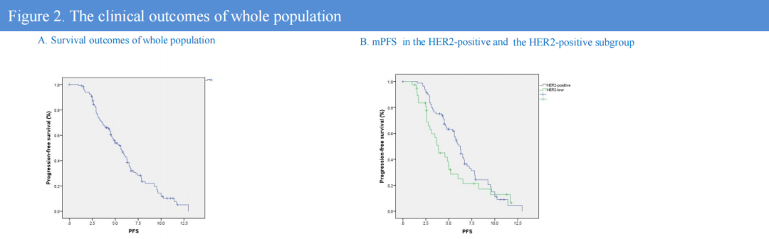 在总体人群中,中位PFS为5.7个月(95%CI:4.6~6.9个月),ORR和DCR分别为38.3%和64.2%。在HER2阳性亚组中,ORR和mPFS分别为42.7%和6.3个月(95%CI:4.9~7.6个月)。在HER2低表达亚组中,ORR和mPFS分别为29.0%和3.6个月(95%CI:2.0~5.3个月)。