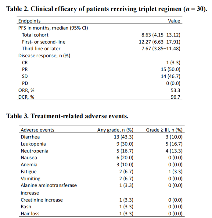 截至2023年1月20日,中位PFS为8.63个月(95%CI:4.15~13.12),中位OS尚未达到。ORR为53.3%,DCR为96.7%。最常见的Ⅲ/Ⅳ不良事件为白细胞减少(16.7%),中性粒细胞减少(13.3%)和腹泻(10%),未发生治疗相关严重不良事件及死亡。