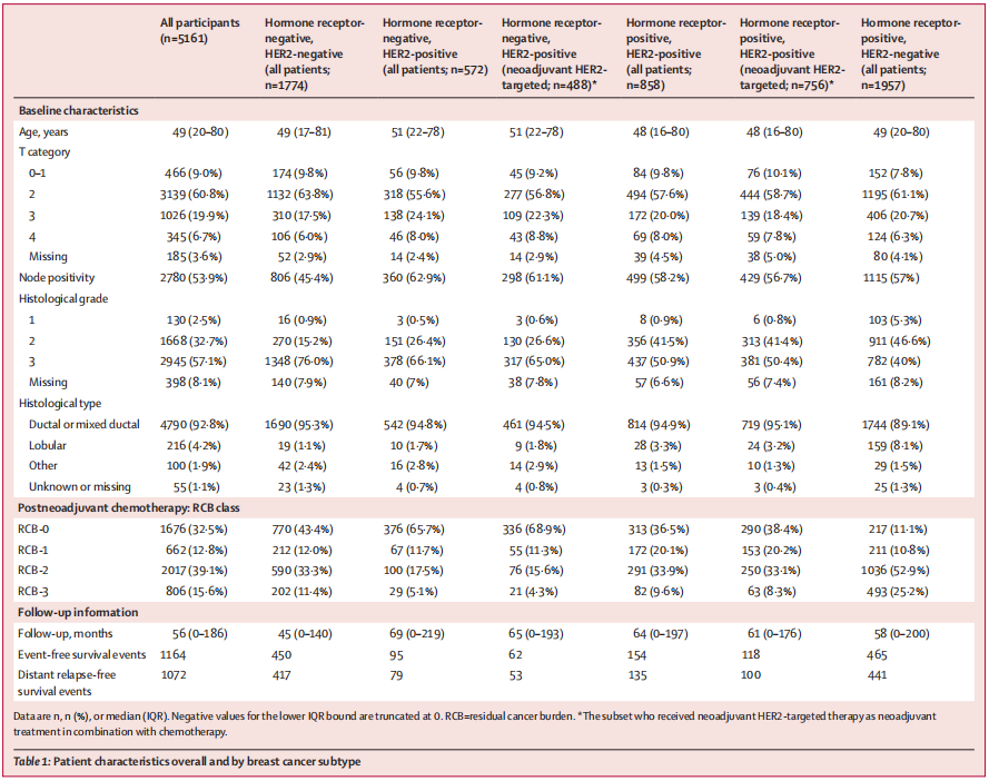 在这项汇总分析中,通过与现场调查人员的沟通,确定了欧洲和美国12个研究所和相关临床试验(4项随机对照试验、8项队列研究),其中包括1994年9月12日至2019年2月11日接受新辅助化疗的5161名患者的数据。2019年11月,我们从接受新辅助化疗和手术治疗的原发性Ⅰ~Ⅲ期乳腺癌患者(18岁)中获得了参与者的RCB结果、临床和病理分期、肿瘤亚型和分级、治疗和随访数据。研究者使用混合效应Cox模型,结合随机RCB和队列效应,评估了连续RCB评分与主要研究结局(无事件生存率)之间的相关性,以解释研究之间的异质性,并分层以解释激素受体状态和HER2状态定义的不同癌症亚型的基线风险差异。