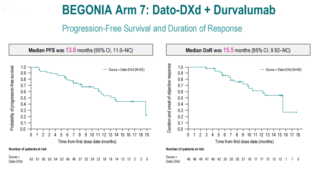 Peter Schmid:BEGONIA是一项非常有趣的试验,2023年ESMO大会上,BEGONIA研究中ARM 7(Dato-DXd+Durvalumab)的数据进行了更新[3]。ARM 7共入组了62例患者,大多数(54例,87%)为PD-L1低表达(TAP<10%)的患者。中位随访时间为11.7个月,Dato-DXd+Durvalumab在一线晚期/转移性TNBC中表现出持久的缓解,确认的ORR为79%(95%CI:66.8~88.3),中位PFS为13.8个月(95%CI:11.0~NC),中位DOR为15.5个月(95%CI:9.92~NC)。