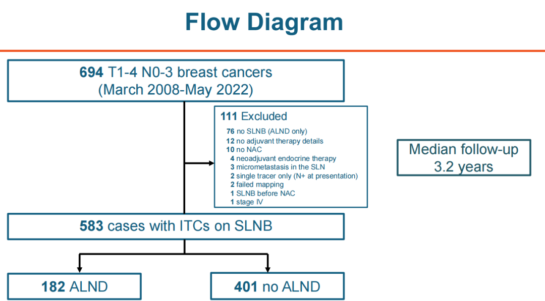 新辅助化疗(NAC)后前哨淋巴结(SLN)阳性的患者有较高的残余淋巴结负荷,腋窝淋巴结清扫(ALND)目前被认为是标准治疗。在接受新辅助化疗的患者中,约1.5%的患者存在残留的分离肿瘤细胞(ITCs),关于残留ITCs患者发现额外阳性淋巴结的可能性数据很少,ALND的获益尚不清楚。因此,我们对这些患者的腋窝手术处理是不规范的。