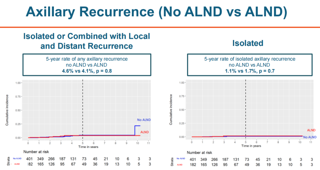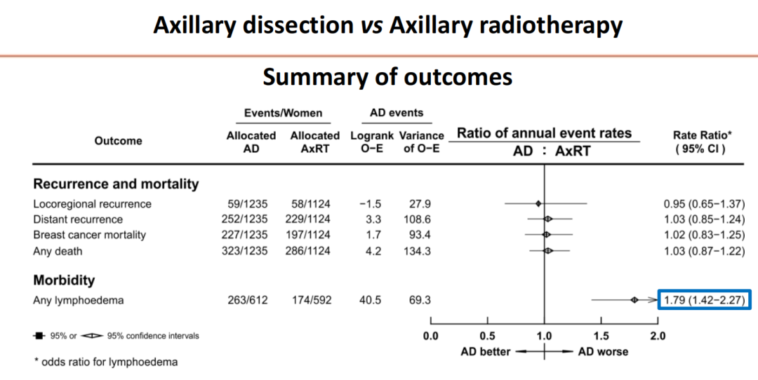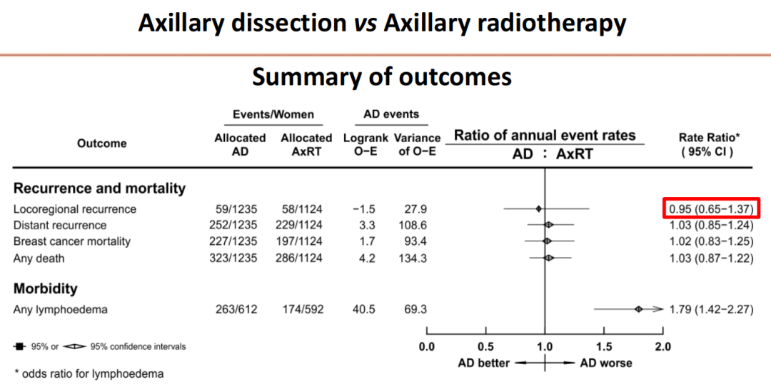 第二个方面是比较ALND和腋窝淋巴结放疗的疗效,同样分为前前哨时代和前哨时代。结果显示,无论在哪个时代,ALND的手术范围对抗肿瘤治疗的安全性没有影响,且ALND和腋窝淋巴结放疗在抗肿瘤治疗方面也是等效的。