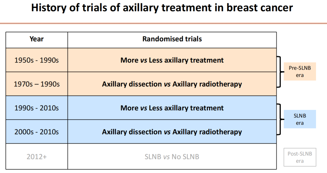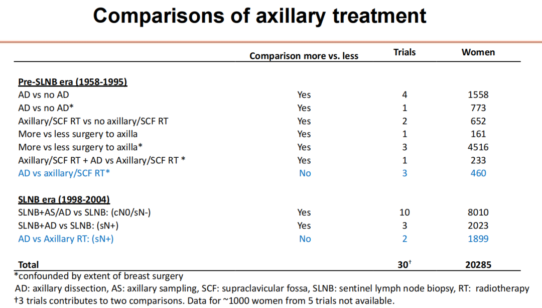 本次SABCS大会上还更新了早期乳腺癌临床试验协作组(EBCTCG)关于早期乳腺癌腋窝治疗的29项随机试验的综述(GS02-05)。该研究包括两方面内容,第一个方面是ALND手术的范围,又分为两个时代,分别是前前哨时代(腋窝不手术vs.ALND)和前哨时代(SLNB vs.ALND)。