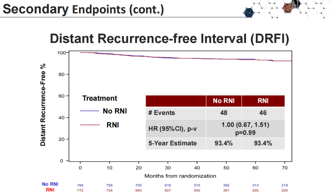 NSABP B-51试验入组了NAC前cT1-3N1M0、NAC后经前哨淋巴结活检(SLNB)或ALND后判断为ypN0的患者,并对其进行随机分组,如果采用保乳治疗,则随机分配到全乳放疗组和全乳+区域淋巴结放疗(RNI)组;如果患者采用全乳房切除手术,则随机分为乳房切除术后放疗(PMRT)+RNI组和无术后放疗组。NSABP B-51试验主要研究终点无浸润性乳腺癌复发间期(IBC-RFI),次要终点包括无局部复发间期(LRRFI)、无远处复发间期(DRFI)、无病生存期(DFS)和总生存期(OS)。