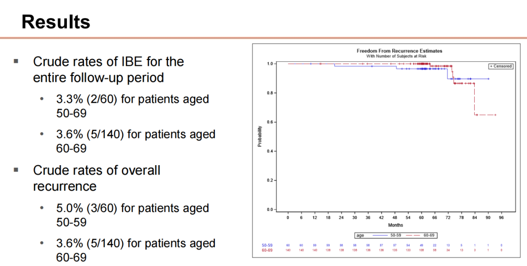 2015年6月至2018年10月期间,来自13家美国机构的200名符合条件的患者入组。中位随访时间为5.2年,对186例患者临床随访至少56个月。总体和乳腺癌特异性5年生存率均为100%,5年无复发率为99%。50~59岁和60~69岁患者的同侧乳腺事件(IBE)粗发生率在整个随访期间分别为3.3%(2/60)和3.6%(5/140);50~59岁和60~69岁患者粗复发率分别为5.0%(3/60)和3.6%(5/140)。