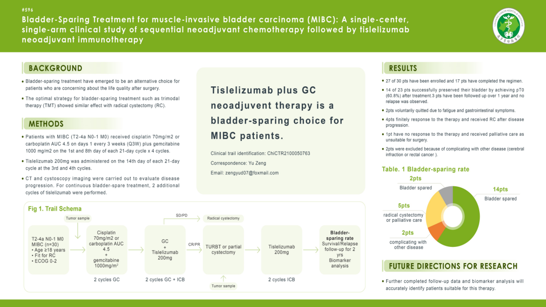 5.Bladder-Sparing Treatment for muscle-invasive bladder carcinoma(MIBC):A single-center,single-arm clinical study of sequential neoadjuvant chemotherapy followed by tislelizumab neoadjuvant immunotherapy.2023 ESMO IO.Abstract 463.