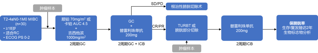 该研究纳入人群为MIBC患者(T2-4aN0-1M0),在第1-4周期中,患者在第1天接受顺铂70 mg/m2或卡铂AUC 4.5治疗;同时,在第1天和第8天接受吉西他滨1000 mg/m2治疗。另外,在第3-4周期中,患者还需在第14天接受替雷利珠单抗200 mg治疗。在治疗过程中,通常在第2-4周期进行CT或膀胱镜评估疾病进展。若疾病缓解、降期明显,则行TURBT术切除原发灶;若发现疾病进展或无变化,则转为膀胱全切根治治疗。对于后续继续进行保膀胱治疗的患者,在手术治疗后将额外补充2个周期的替雷利珠单抗治疗。