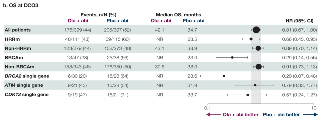 2022年报道的PROpel研究则进一步探讨了在mCRPC一线治疗中,使用奥拉帕利+阿比特龙+ADT或安慰剂+阿比特龙+ADT的疗效和安全性,这些入组患者是不经过基因检测筛选的。当时数据公布时非常振奋人心,我们可以看到在全体人群中,奥拉帕利组的影像学无进展生存期(rPFS)可相较于安慰剂组显著延长(24.8 vs 16.6个月,HR 0.66,P<0.0001);遗憾的是,全体人群的OS不是那么令人满意,没有达到显著统计学差异(42.1 vs 34.7个月,HR 0.81,P=0.0544)。但是在后续的亚组分析中发现,携带BRCA突变(HR 0.29)或HRR突变(HR 0.66)的患者OS获益较好,这次ASCO-GU进一步报道了不同HRRm的疗效,显示BRCA2(HR 0.20)、ATM(HR 0.79)、CDK12(HR 0.57)等常见HRRm类型患者均有OS获益。目前,NCCN等国际权威指南也是推荐mCRPC患者进行基因检测,如果携带BRCA1/2等HRR基因突变的患者可应用奥拉帕利+阿比特龙一线治疗。
