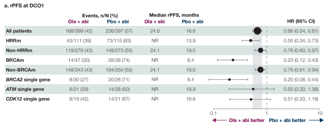 本次ASCO-GU大会报道了该研究HRRm人群的详细数据:总体上有28.4%的患者携带HRRm,非HRR突变以及不同HRR突变基因患者的rPFS均有一致获益。OS是大家较为关注的结果,在常见的HRR突变类型(BRCA2、ATM、CDK12)中,也都显示有利于奥拉帕利的生存获益优势,其中BRCA2突变患者的rPFS和OS HR仅为0.20;ATM突变患者的rPFS和OS HR为0.55和0.79;CDK12突变患者的rPFS和OS HR为0.51和0.57。