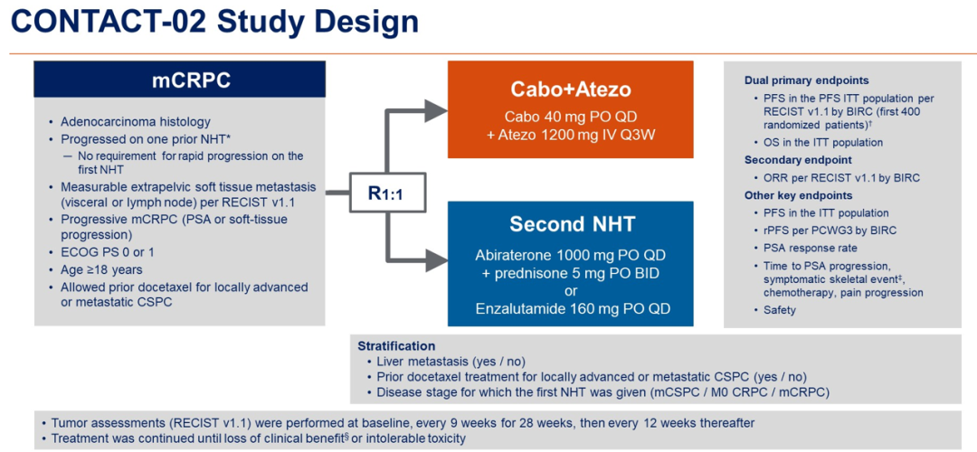 这项研究其实具有一定的历史背景。众所周知,卡博替尼在前列腺癌的治疗中有众多尝试,既往COMET-1研究分析了卡博替尼治疗骨转移CRPC患者的疗效,虽然结果显示中位rPFS有所改善,但最终OS并无显著获益,因而卡博替尼单药治疗未能获批。随后进行了COSMIC 021研究,亚组分析表明卡博替尼联合阿替利珠单抗安全性良好,并且伴内脏转移或盆腔以外淋巴结转移患者的DCR和PSA反应率优于单药治疗,因而才进行了这项CONTACT-2研究。