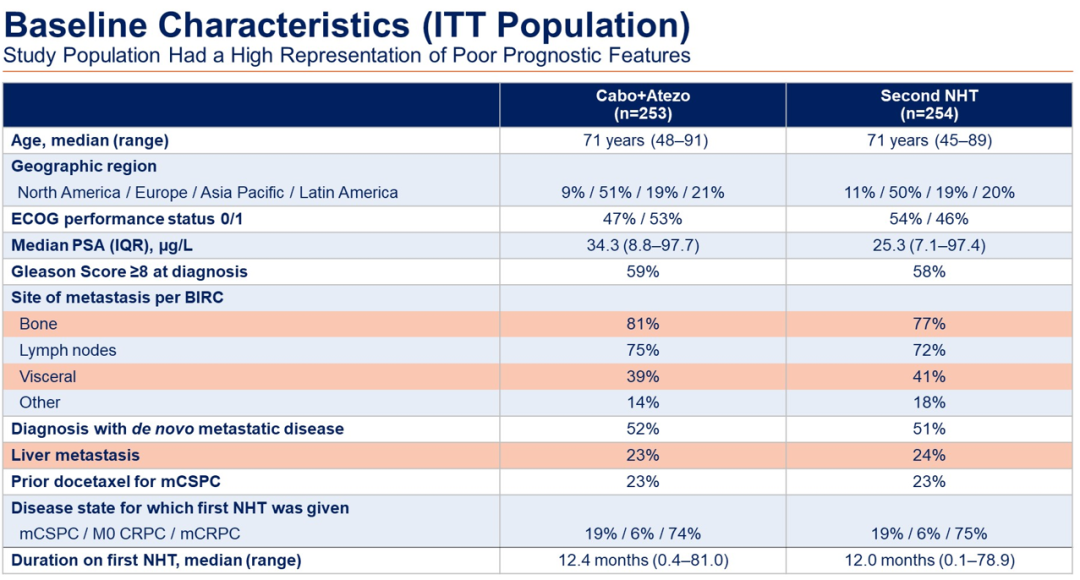 从基线特征可以看出,入组人群的病情更加严重,联合治疗组和对照组中均存在肝转移(23%vs.24%)。联合治疗组和对照组中使用化疗经治mCSPC的患者比例均为23%,使用新型内分泌药物一线治疗mCRPC的比例分别为74%和75%。总体而言,两组患者基线特征相似。