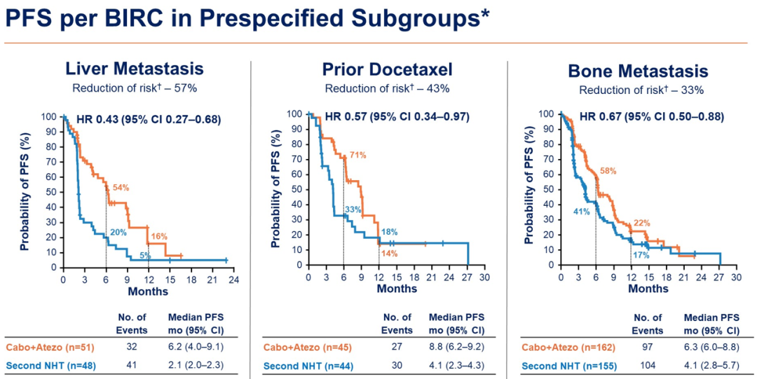 从疗效方面看,联合治疗组和对照组的无进展生存期(PFS)分别为6.3个月和4.2个月,表明卡博替尼联合阿替利珠单抗可降低35%进展风险。同时更重要的是,肝转移亚组也存在明显改善,PFS可从对照组的2.1个月延长至6.2个月;而对于既往接受过化疗的患者人群(8.8个月vs.4.1个月)和骨转移人群(6.3个月vs.4.1个月)而言,同样仍然具有显著获益。