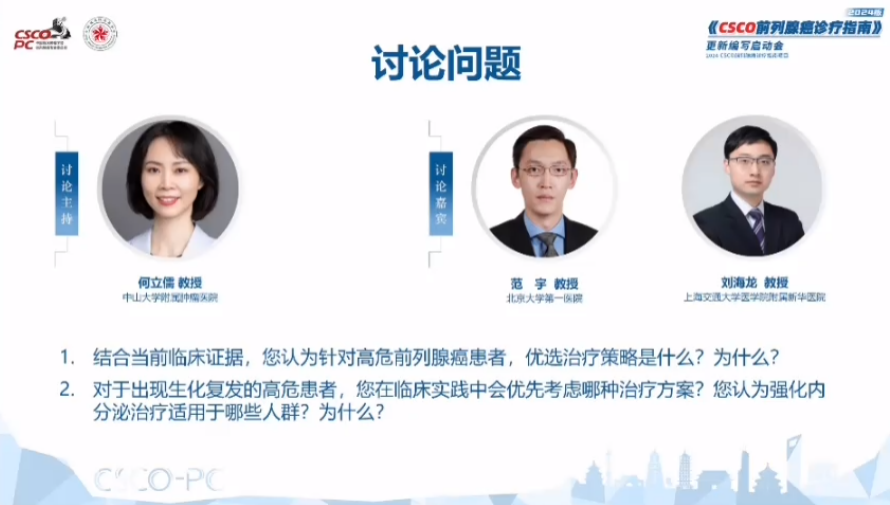 讨论环节由中山大学附属肿瘤医院何立儒教授主持,来自北京大学第一医院范宇教授、上海交通大学附属新华医院刘海龙教授就局限期高危前列腺癌的诊疗策略展开了热烈讨论:对于局限高危前列腺癌患者,可以看到GETUG-AFU 18研究证明高剂量RT联合长程ADT的治疗获得了目前最好的长期随访下的疗效结果,但结合中国国情及前列腺癌的放疗现状来看,目前存在两个为主的综合治疗选择:手术和放疗,通常会首选手术为主,也期待CSCO指南给我们带来规范的指引。对于生化复发高危患者的治疗选择,通常会以挽救性放疗联合ADT为主,EMBARK研究结果的公布填补了BCR患者新型内分泌治疗领域的空白,也证明了强化内分泌治疗的前移展现出积极的治疗效果,但在临床实践中仍需要考虑患者全程治疗策略的排兵布阵,根据患者的合并疾病和身体情况,合理选择联合治疗模式(药物种类、时机、时长),平衡疗效与安全性管理。