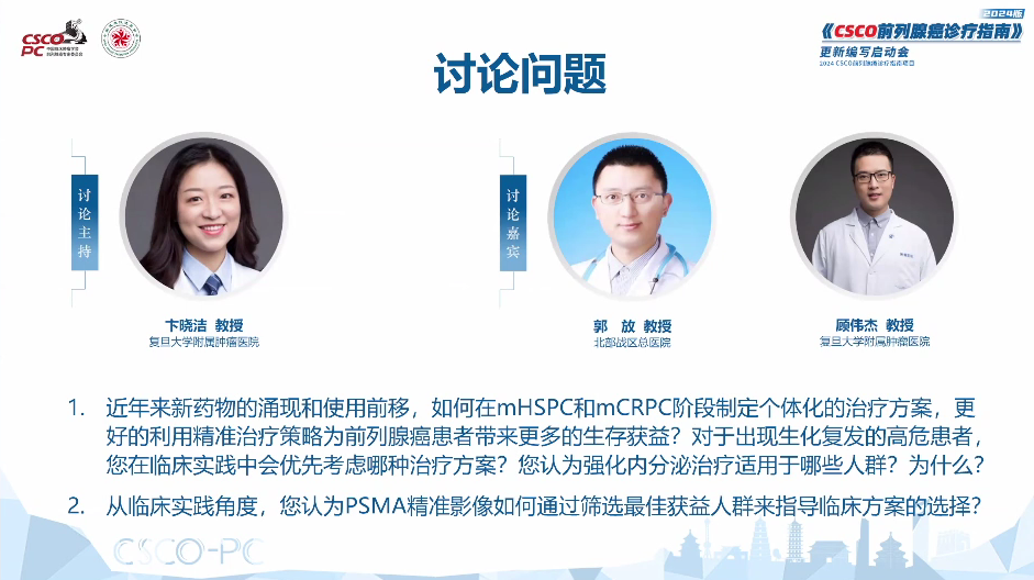 最后的讨论环节中,由复旦大学附属肿瘤医院卞晓洁教授主持,北部战区总医院郭放教授、复旦大学附属肿瘤医院顾伟杰教授就mHSPC及mCRPC患者精准治疗策略及PSMA在临床实践中如何更好的应用展开讨论:mHSPC及mCRPC患者近年来的治疗有所突破,目前对于这类患者制定个体化治疗方案应更关注联合治疗方案的选择,同时重视基因检测,关注患者的分子分型,选择更为合适的药物;随着精准医学的进步,前列腺癌这一高度异质性肿瘤需探索更多的新靶点。PSMA等精准影像技术的应用,使得前列腺癌复发、转移等诊断准确率有了显著提升,但目前在国内可及性较差,检测费用较高,也期待未来更多的应用,给患者带来更大的获益。