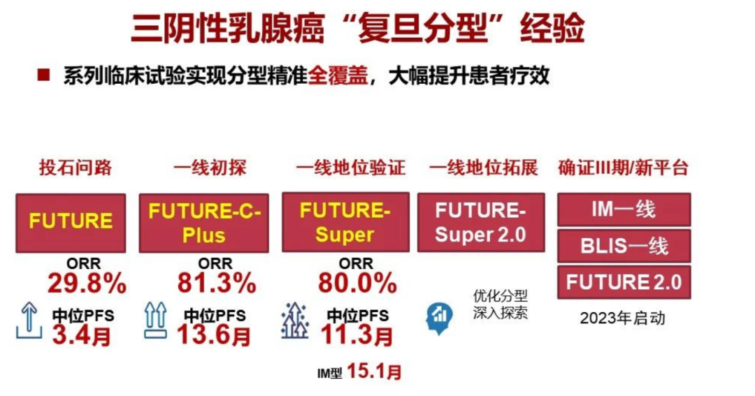 系列临床试验实现分型精准全覆盖,大幅提升了患者疗效。此外,FUTURE-SUPER 2.0研究和多个Ⅲ期临床研究也正在开展中,期待相关结果早日公布,使得三阴性乳腺癌的精准治疗有进一步突破。