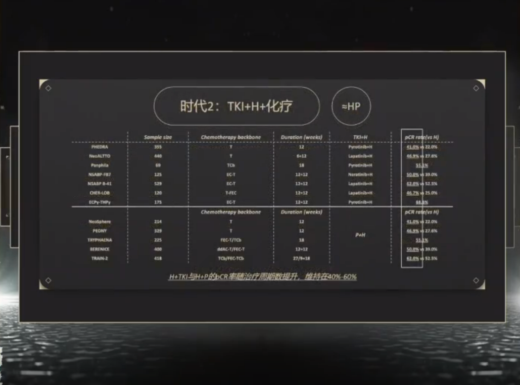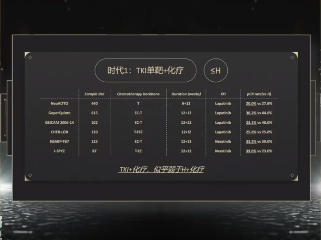 20多年前,曲妥珠单抗(H)的横空出世改变了HER2阳性乳腺癌患者的生存和治疗路径。NOAH等一系列临床研究证明,HER2阳性患者新辅助治疗,曲妥珠单抗联合化疗与单用化疗相比,能够显著提高pCR率。随后,小分子TKI药物出现,一系列研究对TKI单靶+化疗在新辅助治疗中的治疗效果进行了探索,但得出的结论是TKI+化疗的效果似乎弱于H+化疗。