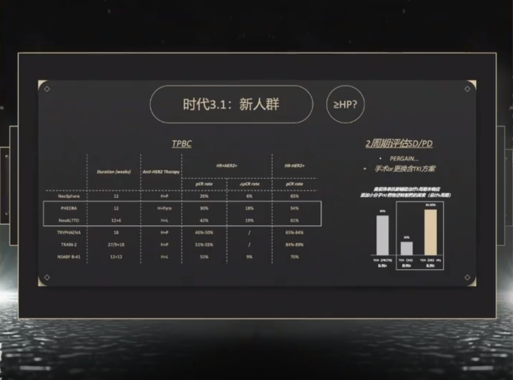 李俊杰教授介绍到,在新时代,我们需要寻找大小分子联合新辅助治疗的优效人群。而PHEDRA、NeoALTTO等相关研究结果提示,在HR+/HER2+(三阳性乳腺癌;TPBC)乳腺癌患者新辅助治疗中,大小分子联合治疗的效果较好。由此我们思考,今后可以在这些人群中探索大小分子联合治疗的整体策略。
