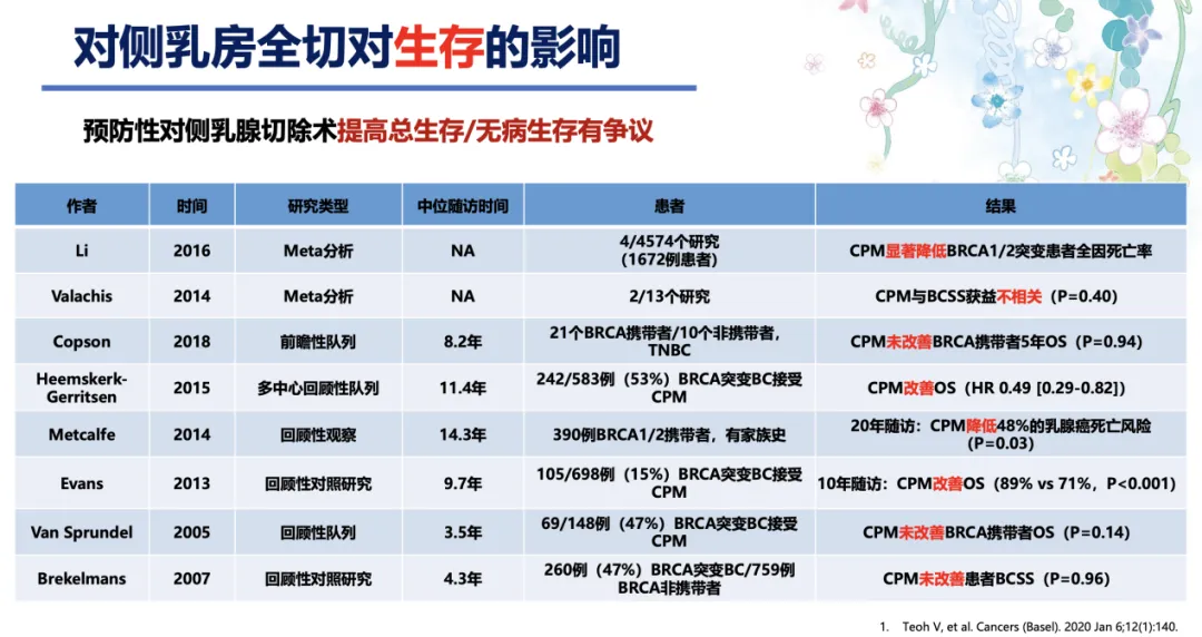 肿瘤相关因素的影响包括对侧乳房发生乳腺癌的风险和对侧乳房全切对生存的影响。gBRCA致病突变携带者与未携带着相比,对侧乳腺癌风险显著增高4~5倍,但不同个体间存在较大差异[4]。既往研究表明,如果将对侧乳房保留,一旦对侧罹患乳腺癌,即使后续进行规范的手术和辅助治疗,其无复发生存也较非gBRCA突变携带者差很多[5];如果行预防性对侧乳乳腺癌切除术,则可降低gBRCA1/2突变携带者乳腺癌患病风险[6]。我们最终的目的是改善患者的长期生存,但非常遗憾的是,多项前瞻性和回顾性研究的10年、甚至20年随访结果并不一致,预防性对侧乳腺切除术提高总生存或无病生存仍存在争议[7]