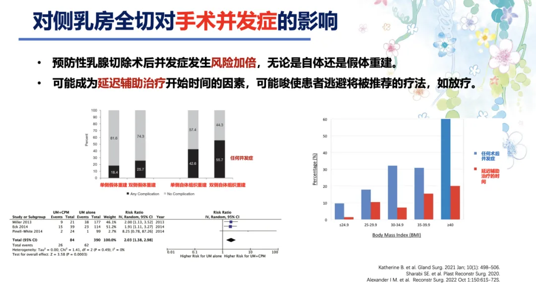 与非肿瘤相关因素的影响包括对侧乳房全切对手术并发症的影响和对整形美容的影响。从既往研究[9-11]中可以发现,对侧乳房全切后无论是进行自体组织重建还是假体重建,双侧乳房重建较单侧重建术后并发症的发生风险加倍。此外,由于术后并发症带来的负面影响,患者可能会延迟辅助治疗开始的时间,比如放疗时间延迟。