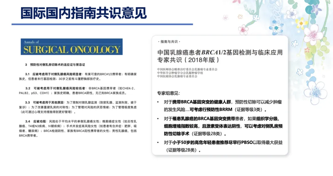 2021 St.Gallen大会上,85%的专家组成员推荐年轻、gBRCA1/2突变患者选择预防性乳房切除。此外,《中国乳腺癌患者BRCA1/2基因检测与临床应用专家共识(2018年版)》[1]《美国乳腺外科医师学会共识声明》[16]等国内外指南共识也都表明,对于已经罹患乳腺癌的gBRCA突变患者,选择对侧预防性乳房切除的证据等级较高。但《中国乳腺癌患者BRCA1/2基因检测与临床应用专家共识(2018年版)》对人群有一定条件限制,专家组意见指出:对于携带BRCA基因突变的健康人群,预防性切除可以减少肿瘤的发生风险.....可考虑行双侧预防性乳腺切除术(证据等级3类);对于罹患乳腺癌的BRCA基因突变携带患者,如果组织学分级细胞增殖指数较高,且激素受体表达阴性,可以考虑对侧乳房预防性切除手术(证据等级2B类);对于小于50岁的高危年轻患者推荐尽早行预防性双侧输卵管卵巢切除术以取得最大获益(证据等级2B类)。