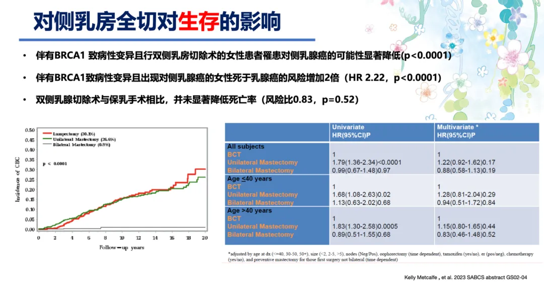 从2023 SABCS大会报道可以看到,伴有gBRCA1致病突变的乳腺癌患者,双侧预防性切除并未显著降低死亡率(HR 0.83,P=0.52)。但对侧乳房未预防性切除且患者未来出现对侧乳腺癌,患者的死亡风险增加2倍(HR 2.22,P<0.0001),长期生存非常差[8]