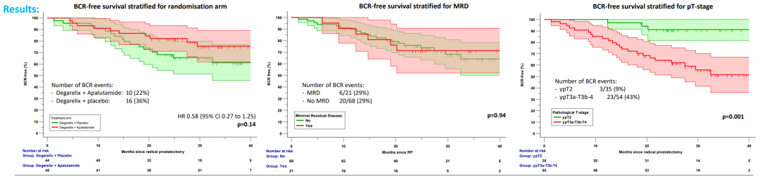 一项是来自比利时的多中心2期ARNEO研究(摘要号:A0602),该研究将新型GnRHR拮抗剂地加瑞克(Degarelix)作为雄激素剥夺(ADT)方案,在此基础上联合或不联合二代雄激素受体拮抗剂阿帕鲁胺(DEG+APA)新辅助治疗。本次大会报道了该研究的3年肿瘤学结局。尽管单独DEG组和DEG+APA的无复发生存率没有显著差异,但在数值上降低了14%(22%vs.36%,HR 0.58,P=0.14),且ypT2分期的亚组患者无复发生存率有显著提升(9%vs.43%;P=0.001;见下图右);此外,联合组的无转移生存率也有显著提高(2.2%vs.14%,P=0.04)。