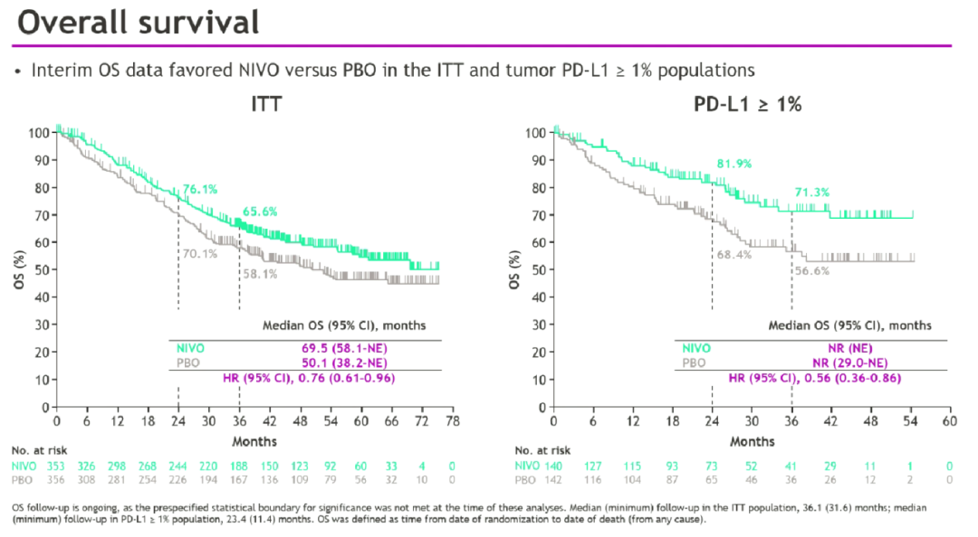△本次EAU大会报道的CheckMate 274研究OS结果:中位随访36.1个月,无论是在ITT人群(69.5 vs.50.1个月;HR 0.76,95%CI 0.61-0.96)还是PD-L1表达≥1%人群(NR vs.NR;HR 0.56,95%CI 0.36-0.86),均提示纳武利尤单抗组具有获益趋势,预设的多个亚组也显示纳武利尤单抗组具有获益趋势。