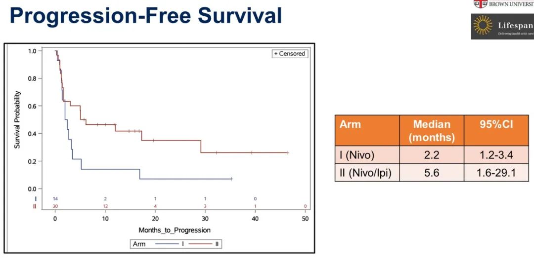 比较单一免疫治疗和两种免疫药物联合使用的生存数据:中位PFS分别为2.2个月和5.6个月,中位PFS分别为17.3个月和24.7个月。重要的是,对纳武利尤单抗+伊匹木单抗联合治疗有应答的患者,其治疗反应具有持久性,并且有几名患者仍在参加临床试验,并且能够继续接受治疗超过两年。