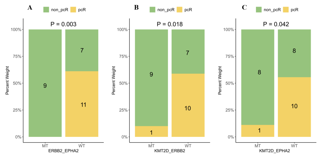 1年和3年的PFS率分别为85.2%和77.6%;1年和3年的OS率分别为96.2%和84.6%。在PD-L1表达≥5%的患者中(n=16),pCR和PaR率分别为43.8%(7/16例)和68.8%(11/16例)。在PD-L1表达<5%的患者中(n=11),pCR率和PaR率分别为36.4%(4/11例)和63.6%(7/11例)。PD-L1表达状态和TMB及pCR率无关。进一步的生物标志物分析表明,任何存在KMT2D/ERBB2/EPHA2双共突变的患者与较低pCR率相关。