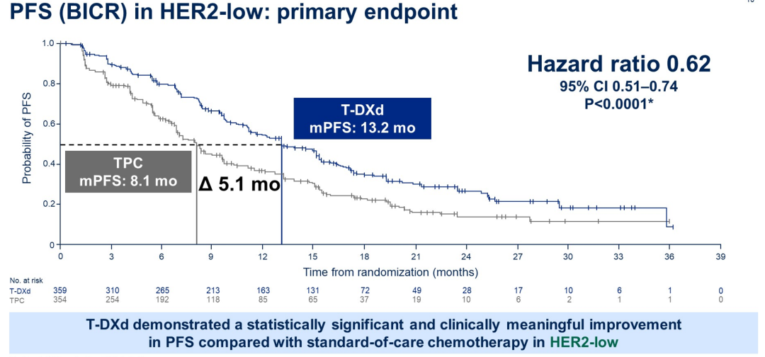 甘露教授:对于HER2低表达的患者,DB-04研究的成果确实为我们提供了新的治疗思路。这项研究已经表明,无论患者是HR阳性还是阴性患者(这些患者为接受过内分泌治疗和1-2线化疗的患者),新型HER2抗体偶联药物(ADC)T-DXd可相较于研究者选择的化疗显著延长无进展生存期(PFS)。这一结果为我们指明了HER2低表达、激素受体阳性患者治疗的新方向。尽管对于HR阳性晚期乳腺癌,我们已经拥有包括CDK4/6抑制剂和PAM通路抑制剂在内的多种治疗手段,但治疗进展后接受化疗的疗效仍然不尽如人意,PFS获益通常只有5-6个月。这意味着许多患者的治疗需求尚未得到满足。DB-04研究结果的公布为HER2低表达患者带来了希望,此类患者以往没有机会使用ADC药物。