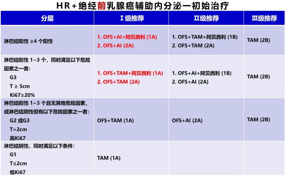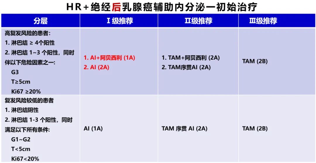 2024 CSCO乳腺癌诊疗指南根据患者处于绝经后/绝经前状态和复发风险进行诊疗推荐:①对于绝经前患者的初始治疗,指南根据复发风险分了4层进行推荐:对于腋淋巴结≥4个阳性的最高危患者,I级推荐是OFS+AI+阿贝西利(1A)或OFS+AI(2A);腋淋巴结1-3个阳性且有任一高危因素(T≥5cm、G3、Ki67≥20%)时,则推荐OFS+TAM+阿贝西利(1A)或OFS+TAM(2A),OFS+AI±阿贝西利作为Ⅱ级推荐;淋巴结1-3个阳性无其他高危因素或淋巴结阴性但有任一危险因素(G2或G3、T>2cm、高Ki67指数)时,I级推荐为OFS+他莫昔芬(1A),OFS+AI作为Ⅱ级推荐;而对于最低危患者(淋巴结阴性且T≤2cm、G1、低Ki67指数),指南推荐给予TAM治疗(1A)。②对于绝经后患者,指南根据复发风险分2层进行推荐:高复发风险患者(淋巴结≥4个阳性;淋巴结1-3个阳性伴以下危险因素之一:G3、T≥5cm、Ki67≥20%),I级推荐为AI+阿贝西利(1A)或AI单药(2A);复发风险较低的患者(淋巴结阴性;淋巴结1-3个阳性同时满足以下所有条件:G1-2,T<5cm,Ki67<20%),I级推荐为AI治疗(1A)。