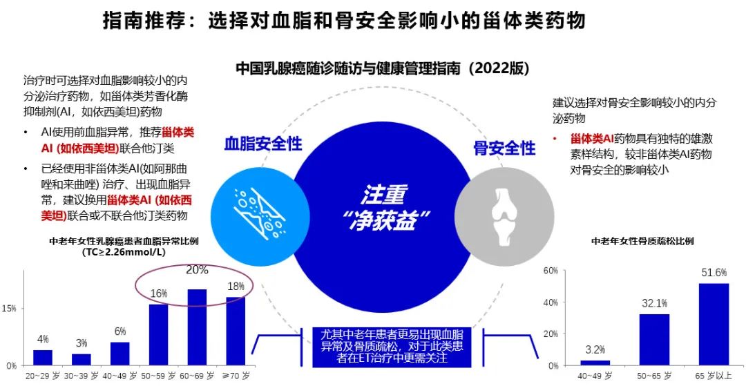 关于辅助内分泌治疗的持续时间,我们应以“净获益”为根本目标,进行个体化决策。辅助内分泌治疗会导致血脂和骨代谢异常等伴随疾病的发生风险升高,尤其中老年患者更易出现血脂异常、骨丢失及骨质疏松等问题。我国50-59岁女性的血脂异常比例约为16%,≥60岁女性的血脂异常比例在20%左右[10];50-65岁女性的骨质疏松比例约为32%,65岁以上女性的这一数据超过51%[11]。为减少内分泌治疗对患者的心血管和骨骼健康的负担,应选择对血脂和骨安全性影响较小的药物。《中国乳腺癌随诊随访与健康管理指南(2022版)》指出为提高HR+乳腺癌患者的“净获益“,推荐选择对血脂、骨安全影响小的甾体AI药物。AI使用前检测出血脂异常的患者,建议AI药物联合他汀类药物治疗;针对已经使用非甾体类AI(如阿那曲唑和来曲唑)治疗、出现血脂异常,建议换用甾体类AI(如依西美坦)联合或不联合他汀类药物。