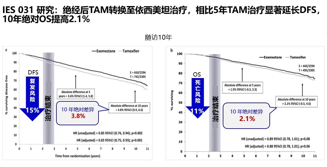 晋俊涛教授:大家好,我是来自巩义市人民医院的晋俊涛医生。近些年来,乳腺癌辅助内分泌的理念不断发展,辅助内分泌治疗经典循证不断迭代,治疗药物和治疗模式逐渐演变。IES 031研究[12]显示,TAM治疗2-3年后转换至依西美坦vs 5年TAM治疗显著延长无疾病生存(DFS),10年绝对总生存(OS)数据提高2.1%,且转换用药不良反应不叠加。EBCTCG荟萃分析[13]显示:5年AI较5年TAM显著降低绝经后早期乳腺癌的10年复发和死亡风险。随着循证医学证据的积累,AI已经成为绝经后HR+乳腺癌患者的首选用药。