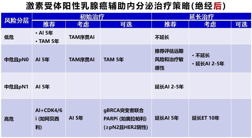2024 CACA乳腺癌诊治指南与规范将HR+早期乳腺癌术后患者分为低危、中危和高危三类人群,根据绝经状态予以推荐:①对于绝经前人群:推荐低危患者选择单药TAM治疗5年,不推荐强化治疗;高危患者需要强化内分泌治疗,推荐OFS联合内分泌治疗联合CDK4/6抑制剂,推荐5年后仍处于绝经前的患者接受TAM治疗5年,5年后转为绝经后状态的患者采用AI治疗5年;中危且pN0患者的治疗方案以及治疗时长应依据“近期复发风险和治疗敏感性”,中危且pN1患者被推荐接受OFS+AI治疗5年,5年后仍绝经前的患者继续接受TAM治疗5年,绝经后状态的患者AI治疗2-5年。②对于绝经后人群,低危患者首选AI治疗5年,也可以选择TAM 5年;高危患者接受AI联合CDK4/6抑制剂,推荐延长5年AI治疗;中危患者AI治疗5年后,pN0患者根据“远期风险和治疗敏感性”决定是否延长内分泌治疗,pN1患者延长AI治疗2-5年。