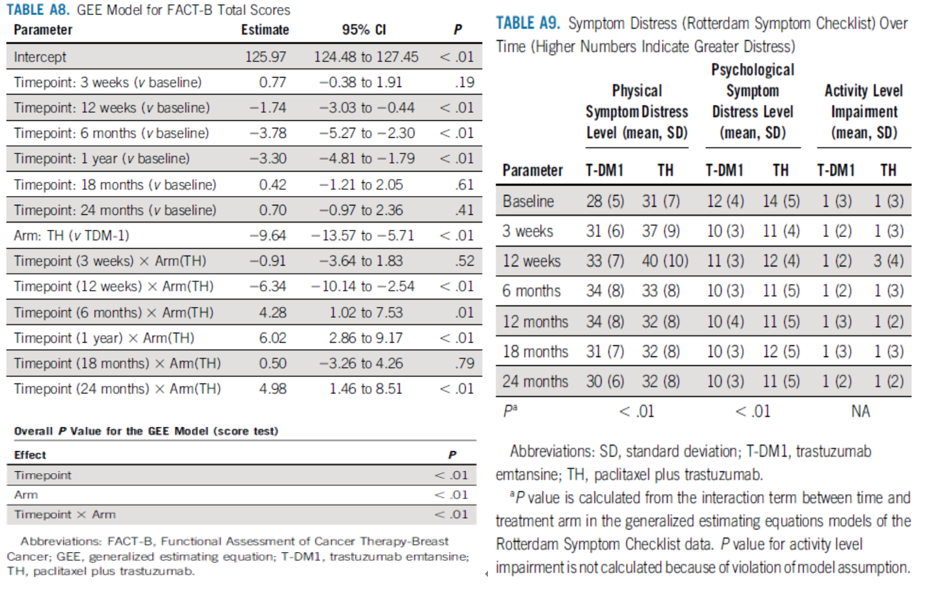 总体而言,497例患者中有469例(94%)完成了PRO调查。纵向模型显示,与T-DM1组患者相比,TH组患者在基线(P<0.01;图8-A8)和至少一个时间点在FACT-B评分方面明显较差,且相对于基线的变化存在显著差异(P<0.01)。患者在分配治疗通知后完成的基线生活质量评估,可能导致基线偏差,从而使T-DM1组的基线生活质量更高;然而TH组患者自基线至第12周的FACT-B下降幅度显著大于T-DM1组(图7)。