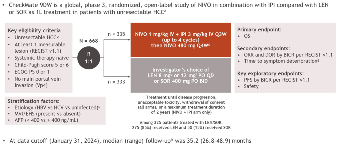 寻琛教授:CheckMate 9DW研究是今年ASCO会议上肝胆领域唯一入选最新突破性摘要(LBA)口头报告的临床研究。该研究为一项国际多中心、随机对照、Ⅲ期临床试验,使用纳武利尤单抗联合伊匹木单抗对比仑伐替尼和索拉非尼一线治疗晚期肝癌患者。这项研究入组了全球多个国家的肝癌患者,中国的27家中心参与其中。研究共纳入668例患者,按1:1随机分为纳武利尤单抗联合伊匹木单抗治疗组(335例)或TKI治疗组(333例),研究中TKI治疗组的85%患者选择了仑伐替尼。主要研究终点为OS,次要终点包括ORR、DoR和至症状恶化时间(TTSD),探索性终点是PFS和安全性。