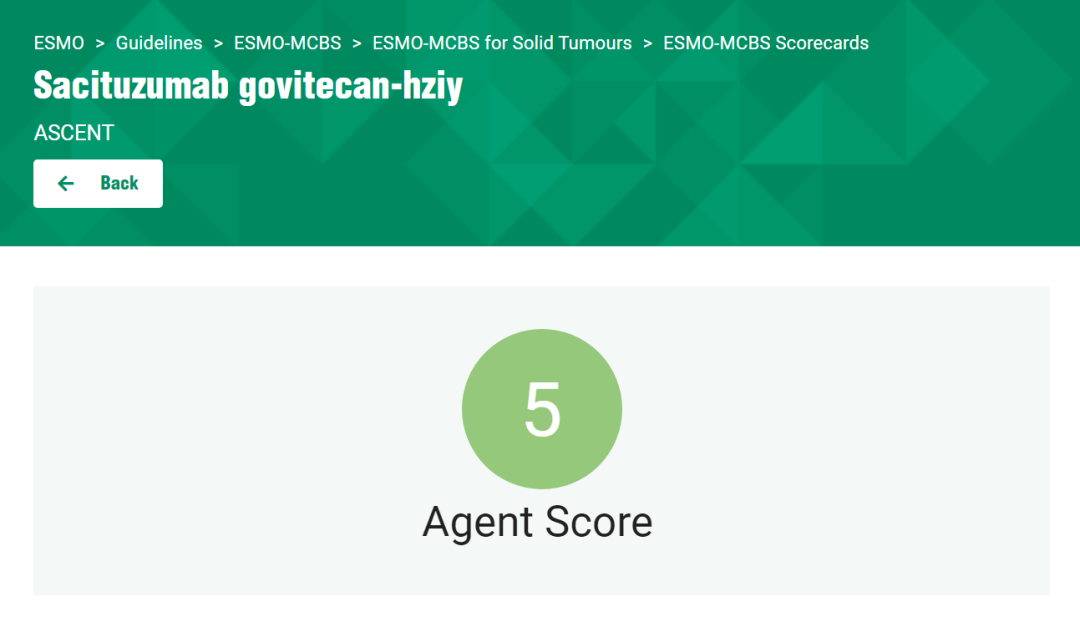 这次推荐“升级”主要基于ASCENT研究SG生活质量(QoL)数据的积极评估结果。ESMO-MCBS评分5是非治愈性治疗方案所能获得的最高评分,意味着该治疗方案能够显著延长生存期和改善生活质量(QoL),同时具有较好的安全性特征。
