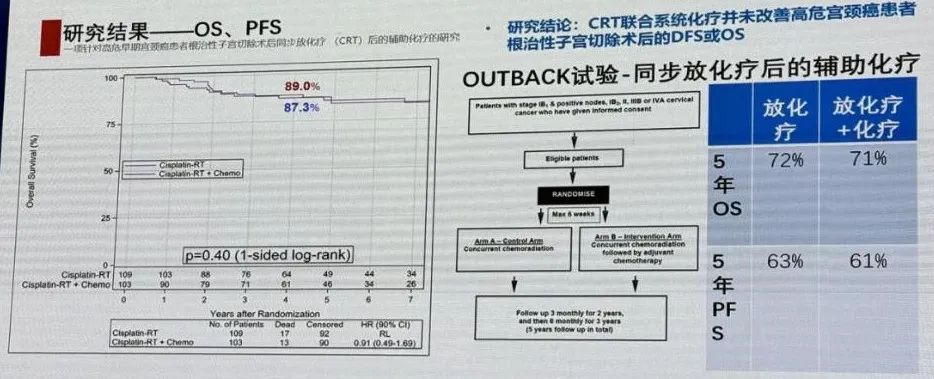 本研究及OUTBACK研究结果均显示,具有高危因素的宫颈癌患者加用辅助化疗未带来额外的DFS、OS或无进展生存(PFS)获益,研究对常见组织类型的宫颈癌术后治疗提供了循证医学证据。