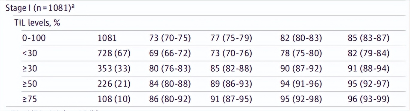 在1966例患者中包含1080例Ⅰ期TNBC患者,这些患者的5年iDFS率为73%(95%CI,70%-75%),RFS率为77%(95%CI,75%-79%),DRFS率为82%(95%CI,80%-83%),总生存率为85%(95%CI,83%-87%)。TIL水平≥50%的患者5年iDFS率为84%(95%CI,80%-88%),RFS率为89%(95%CI,86%-93%),DRFS率为94%(95%CI,91%-96%),总体生存率为95%(95%CI,92%-97%)。而TIL<30%的患者5年iDFS率为69%(95%CI,66%-72%)5年RFS率为73%(95%CI,70%-76%),DRFS率为78%(95%CI,75%-80%),总生存率为82%(95%CI,79%-84%)。