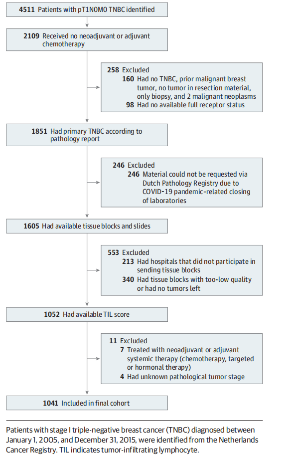 对于肿瘤较小且无淋巴结转移的Ⅰ期三阴性乳腺癌(TNBC)患者,化疗的绝对获益目前尚不清楚,目前还没有生物标志物可用于选择那些可能从新辅助或辅助化疗中获益微乎其微、预后极好的患者。高级别的肿瘤基质浸润性淋巴细胞(sTILs)与TNBC中有利的生存率相关,但缺乏仅针对Ⅰ期TNBC的数据。紧接着4月份的JAMA文章,JAMA Oncology杂志今年6月份又发表了一篇题为《未接受化疗的Ⅰ期三阴性乳腺癌患者中的肿瘤浸润性淋巴细胞检测》的文章。这项队列研究使用了荷兰癌症登记处2005年1月1日至2015年12月31日期间被诊断为Ⅰ期TNBC的患者,只选择了未接受新辅助和/或辅助化疗的患者。数据分析在2023年2月至10月期间进行。
