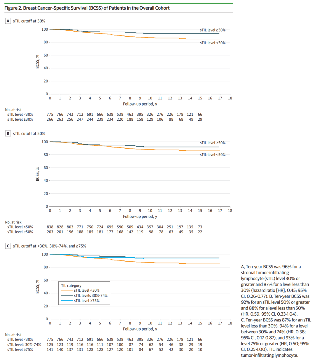 在整个队列中,sTIL水平≥30%与sTIL水平<30%相比,与更好的BCSS相关(分别为96%和87%;风险比<hr/>,0.45;95%CI,0.26-0.77)。