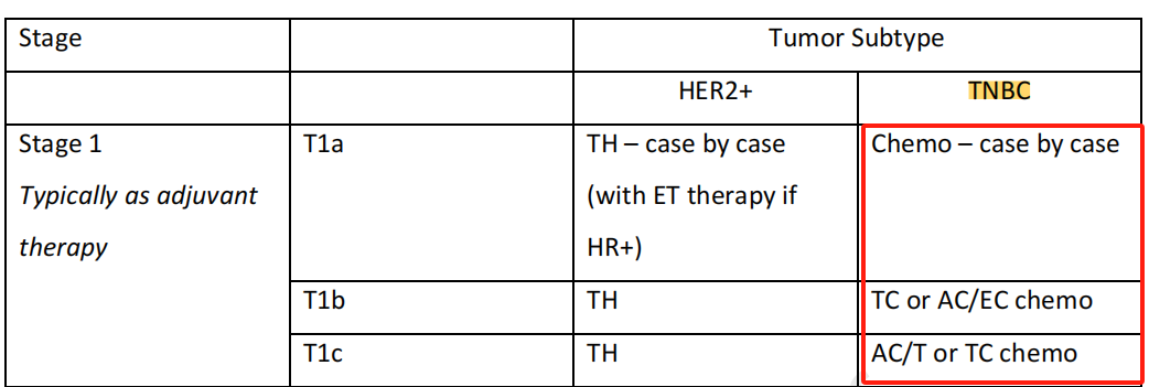 针对Ⅰ期的TNBC患者是否应该进行化疗,国内外各大指南/共识的推荐也不同。《2024 ESMO临床实践指南:早期乳腺癌患者的诊断、治疗和随访——泛亚洲人群适用》[3]中对于T1c的TNBC患者,也建议进行新辅助化疗。《2023 St.Gallen早期乳腺癌国际专家共识》[4]中对于T1c的患者也是支持化疗,但是对于T1a的患者,建议根据患者其他的风险因素来决定是否选择化疗。《NCCN乳腺癌临床实践指南2024年第3版》[5]中对于T1a患者建议可以不进行化疗,T1b但伴随高风险患者可以进行化疗(但不是必须),T1c的患者强烈推荐进行化疗。综上,对于T1c的患者,各大指南/共识都推荐进行化疗,主要争议点在于T1a和T1b患者的治疗策略。